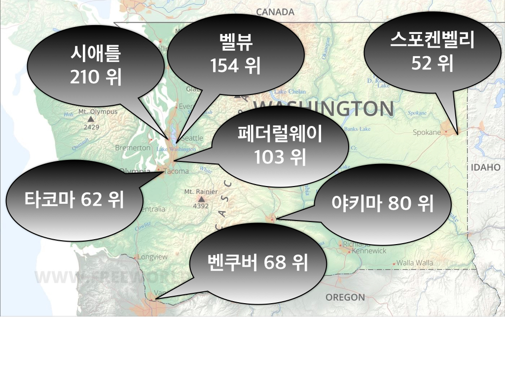 한인 분들이 많이 거주하시는 타코마 지역의 경우 62위로, 동부 워싱턴 주의 스포캔 벨리 52위와 남부 워싱턴의 밴쿠버 60위에 이어 워싱턴 주에서는 3위로 상위권에 들었습니다.